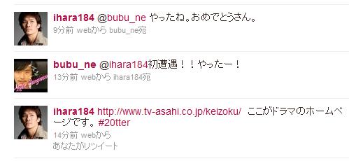 実は何を隠そう、サンウより前から密かに「伊原剛志」さんのファン。 カッコイイ!と思いません? 私の好きなタイプは、”やんちゃないたずら坊主みたいな人”なんですよ^^ 彼のイメージはまさしくコレにピッタシカンカン? 彼、Twitterやっていてほぼ毎日「20tterやります。」って 20分程ON状態で返信してくれるの。 いつも遭遇できなくて口惜しかったんだけど・・・ついに!!です。 開いたらちょうどやってて、慌てて返信。 でも彼宛にリツィートする人多いみたいで 「今日もたくさん返信できなかったごめん!」って最後に言ってて。 そっそれが返信もらえました、わーい♪ たった1行、短い文だけど超嬉しいぞ。 更新されて消えちゃうと困るからその部分画像に残しちゃった(笑) 「20tterやります。」は撮影とかの関係でいつ始まるか不明。 彼も「スケジュールの関係で予定が決められない」って言ってたし。 チョコチョコ覗くしかないんだよね。 でもだいたい昼間が多いみたいで、休んでいる間に遭遇しなきゃ無理!って 半分諦めてたんだけど良かった~^^ コレ見て見て 昼間1度覗いたんだけど、朝終わってた。 撮影(伊豆)行く前にやったみたいで「残念(涙)」って。 そこで彼のつぶやきにリツィードしておいたんだけど・・・ なんと1時間後に返事が来てたんですよ^^ なんという優しさ・・・ううぅぅぅぅ 感激。 こっちも見て見て^^ | カレンダー